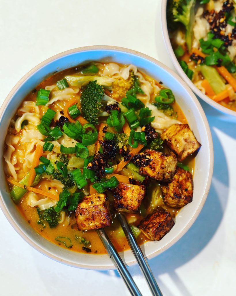 7. To assemble & serve, divide the cooked noodles into two bowls. Ladle the soup over the noodles and top with sliced spring onion, tofu and some chilli oil.